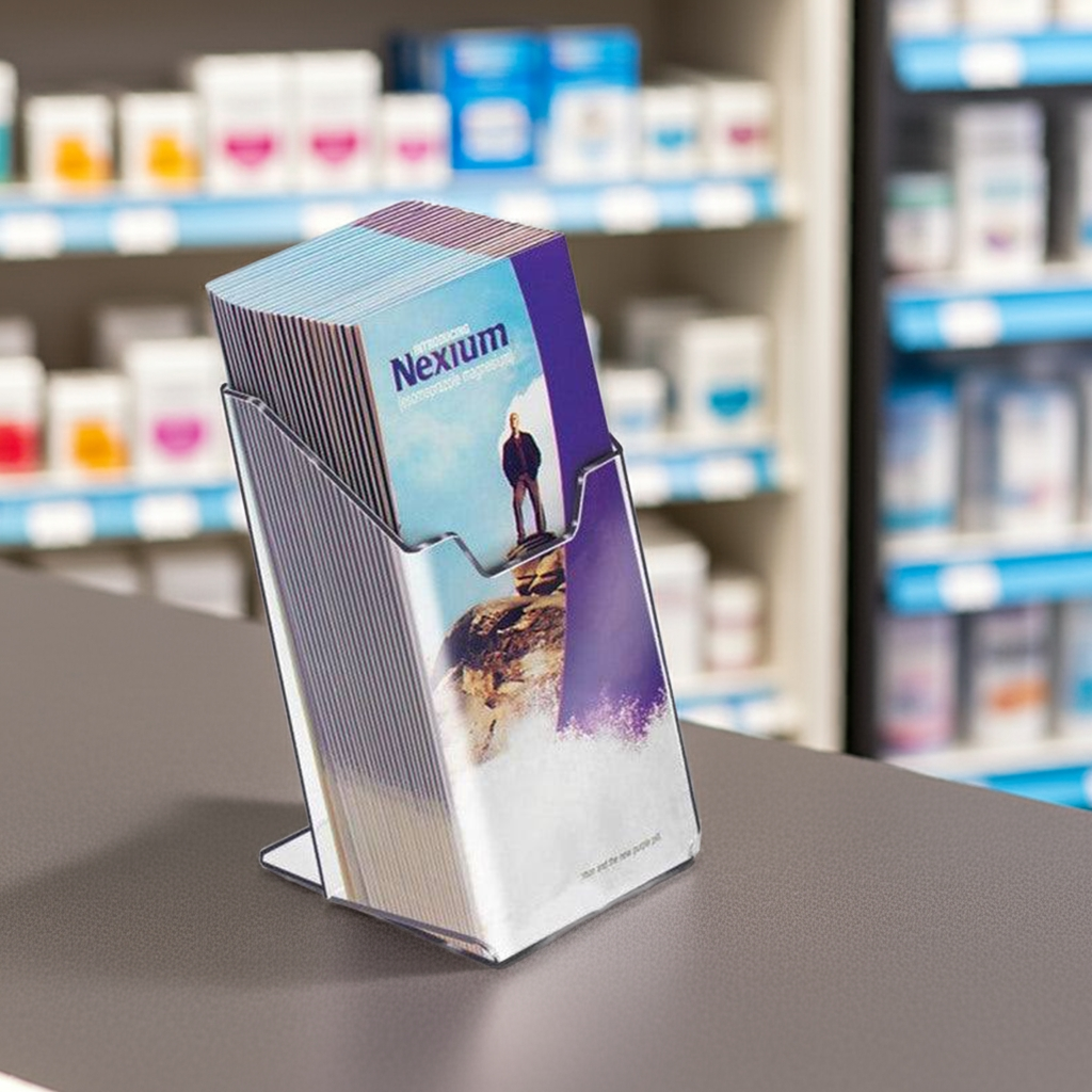 Promote your four-inch-wide brochures in an attention-grabbing way with our Extra Deep Tri-fold Holder. The added capacity allows for larger, thicker brochures to be displayed. The extra depth of this tri-fold holder keeps it full for longer. Top quality crystal clear molded construction maximizes exposure on countertops and ensures long-lasting durability.